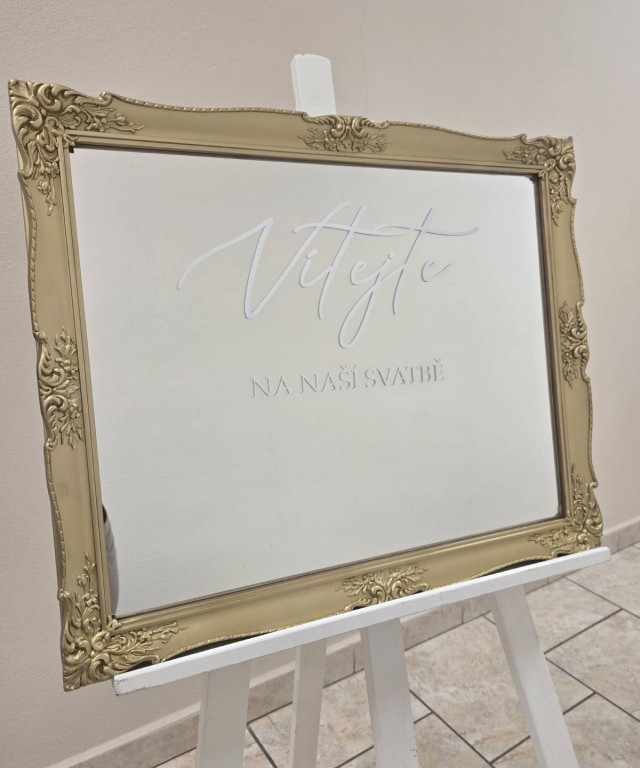 Chcete svým hostům vyrazit dech hned u vchodu? Naše luxusní uvítací zrcadlo v bohatě vyřezávaném zlatém rámu je ztělesněním noblesy. Zapomeňte na obyčejné tabule – toto zrcadlo dodá vaší svatbě punc exkluzivity a romantiky starých časů.